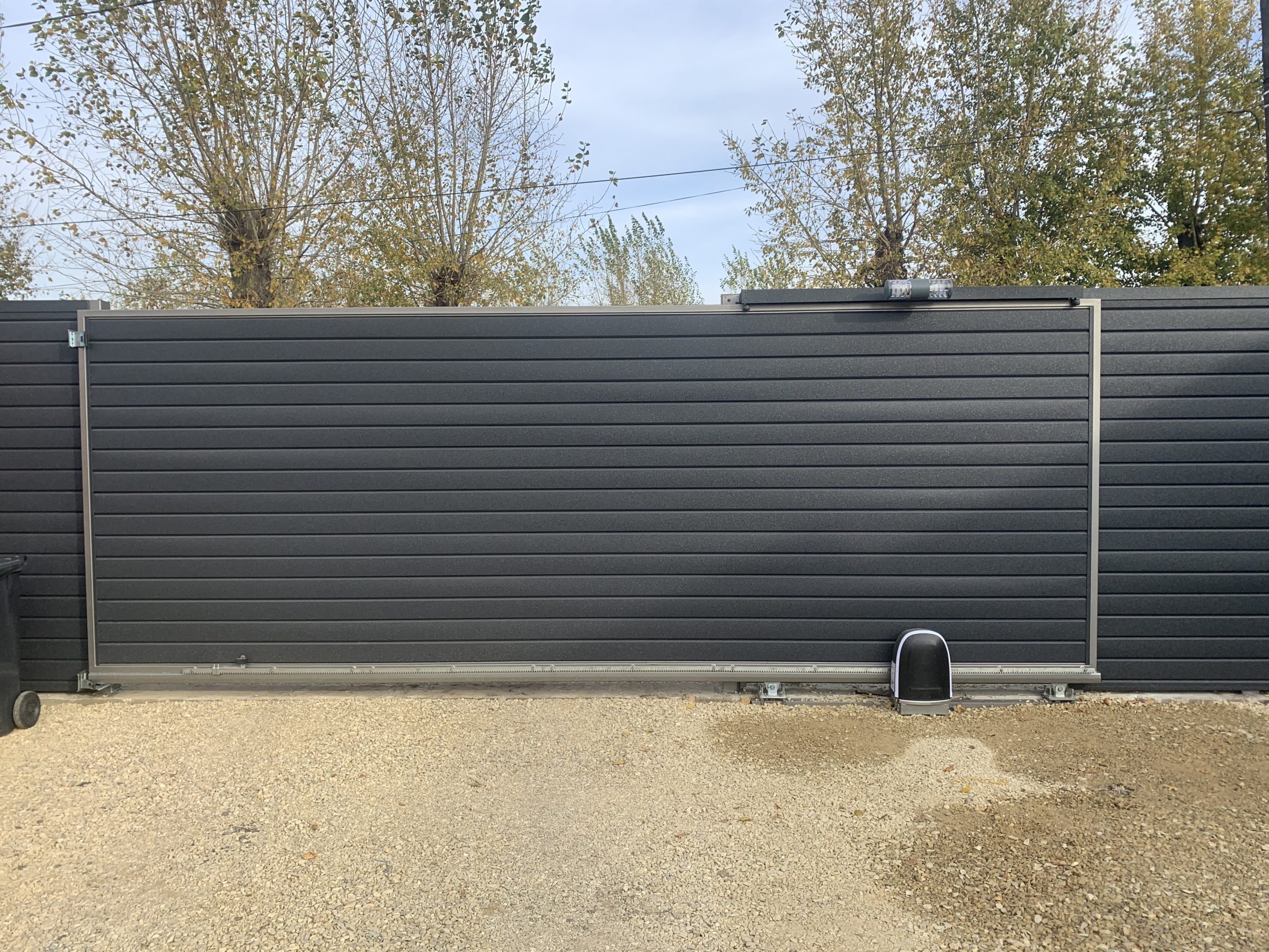 Откатные ворота представляют собой самонесущую конструкцию, в которой алюминиевая рама ворот с заполнением перемещается по роликовым опорам, установленным на фундаменте вне зоны проезда ворот (за проемом).